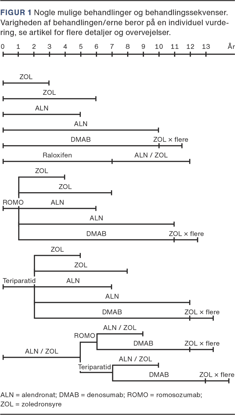Hvis en patient i Danmark på diagnosetidspunktet ikke opfylder kriterierne for knogleanabol behandling, vil førstevalget i sekvensen typisk være alendronat (ALN), hvor der er ti års erfaring fra kliniske undersøgelser [14]. Zoledronsyre (ZOL) til årlig infusion synes gavnligt i op til seks år med hensyn til frakturforebyggelse [15], men der ligger studier med op til ni års varighed. Både ALN og ZOL bindes til knoglerne i mange år og hæmmer osteoklasternes aktivitet og dermed resorption, hvorfor det er muligt at holde pause med medicinen [16] og bevare den frakturbeskyttende effekt [17]. Varighed af pausen efter ALN og ZOL er individuel og afhænger af behandlingsvarighed, frakturrisiko og opnået knoglemineraltæthed (BMD). Det anbefales derfor, at patienter, der holder pause følges med dual-energy X-ray absorptiometry og/eller knoglemarkører. Behandlingen genoptages ved nye frakturer, faldende BMD eller manglende suppression af knoglemarkører. Ved øvrig medicin til behandling af osteoporose kan der ikke holdes pause, uden at effekten mistes [16]. DMAB er der ligeledes ti års erfaring med [18]. Efter blot 1-2 års behandling er det ikke muligt at ophøre med DMAB uden at få øget knogleomsætning, et knogletab og øget risiko for frakturer. Der pågår stadig forsøg, der skal afklare, hvilken behandling der bedst gives efter DMAB [19], og for de fleste vil dette være flere ZOL-infusioner i året efter ophør med DMAB [20]. Raloxifen forebygger vertebrale frakturer, men er ikke vist at reducere nonvertebrale frakturer [21] og er derfor en mulighed til yngre postmenopausale kvinder med mild til moderat osteoporose. Raloxifen er undersøgt i op til otte år [22] og kan ikke stoppes uden et efterfølgende knogletab [16], og det kan derfor være hensigtsmæssigt at skifte til et bisfosfonat for at forhindre et knogletab, selv om der ikke findes studier.