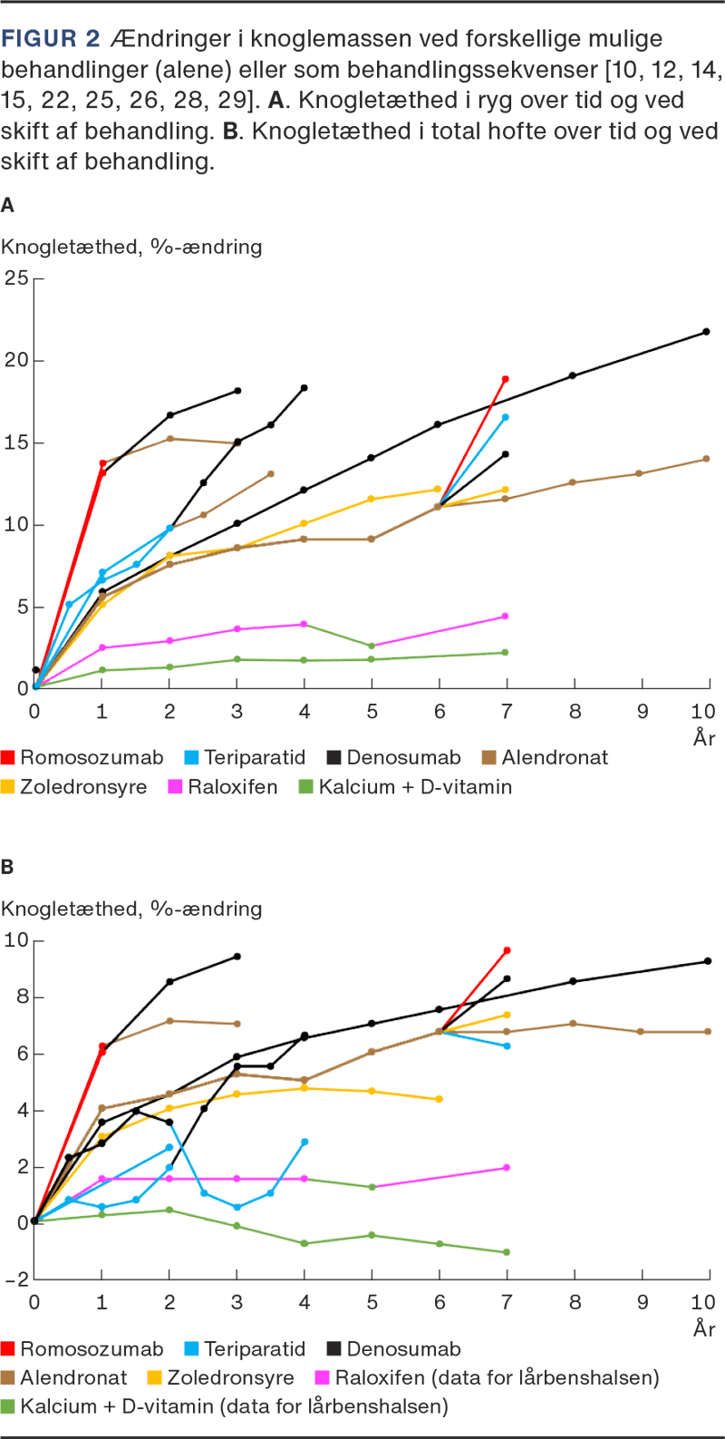 Når en kvinde behandles med bisfosfonat f.eks. ALN, forventes en stigning i knoglemassen, der er størst i de første 2-3 år, og herefter en stabilisering (Figur 2). Skifter man fra bisfosfonat til knogleanabol behandling, forventes ikke så stor stigning i knoglemassen som hos behandlingsnaive. I STRUCTURE-studiet, som inkluderede kvinder med en gennemsnitsalder på 71 år, skiftedes de fra i gennemsnit seks års peroral bisfosfonatbehandling, hvoraf det sidste år var ALN, til et års knogleanabolbehandling med ROMO eller teriparatid. Hos begge grupper sås en stigning i knoglemassen i columna; ROMO 9,8% og teriparatid 5,4%. Kun behandlingen med ROMO førte til stigning i total hofte med 2,9%, hvorimod teriparatidgruppen tabte 0,5% [28]. Giver man DMAB i to år og skifter til teriparatid i to år, ses initialt et knogletab, som er specielt udtalt i hoften, men efter en 48-månedersbehandling ses en stigning på i alt 14% i columna og 2,8% i total hofte [12] og således mindre end den omvendte sekvens.