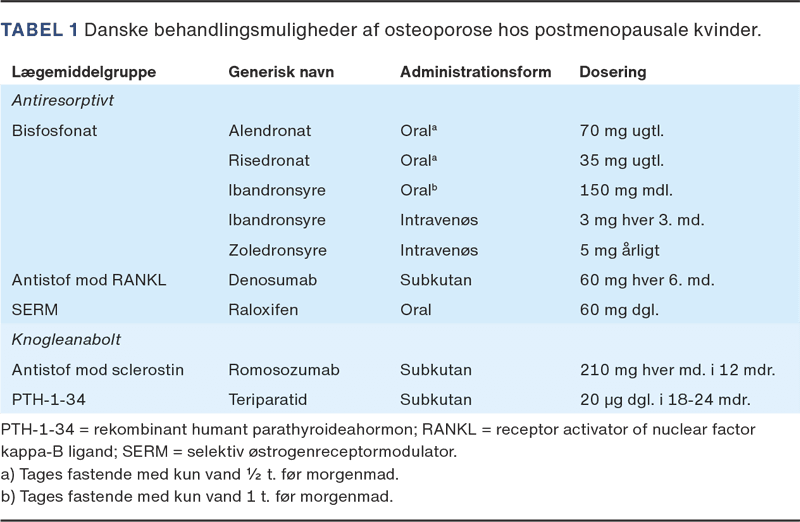 De godkendte lægemidler til behandling af osteoporose reducerer risikoen for frakturer med 20-70% afhængig af lægemiddel og frakturtype [5]. Behandlingen inddeles i antiresorptiv og knogleanabol/dual-action- behandling (Tabel 1).