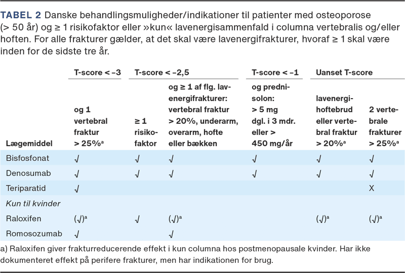 Valg af behandling afhænger af lokalisation af en eventuel lavenergifraktur, inden for sidste tre år samt T-score, og Tabel 2 viser muligheder for første eller efterfølgende behandlinger i en sekvens. Metaanalyser af de randomiserede placebokontrollerede studier, der har undersøgt de tilgængelige behandlinger, har vist, at stigningen i knoglemassen i hoften, i behandlede grupper sammenlignet med placebogrupperne, prædikterer frakturforebyggelse bedre end stigningen i knoglemassen i lænderyggen [6].