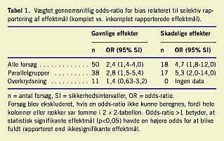 Randomiserede kliniske forsøg med statistisk signifikante fund publiceres oftere end - og før - forsøg med negative fund [1]. I modsætning til denne velbeskrevne publikationsbias er selektiv rapportering af positive effektmål inden for hvert forsøg ikke undersøgt tilsvarende grundigt. Man har længe haft mistanke om eksistensen af en sådan bias [2], men de hidtidige anekdotiske rapporter er ikke nødvendigvis repræsentative [3] og kan selv være et resultat af publikationsbias.