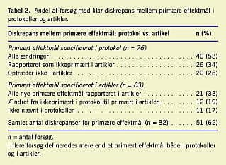Primære effektmål blev defineret for 82 ud af de 102 forsøg (80%) enten i protokollen, tillægsprotokoller eller i de publi-cerede artikler. I alt 51 ud af 82 forsøg (62%) havde klare dis-krepanser mellem det primære effektmål angivet i protokoller og de primære effektmål angivet i de publicerede arbejder (Tabel 2 ). I ingen af de publicerede artikler var det anført, at en ændring i de primære effektmål havde fundet sted i forhold til protokollen.