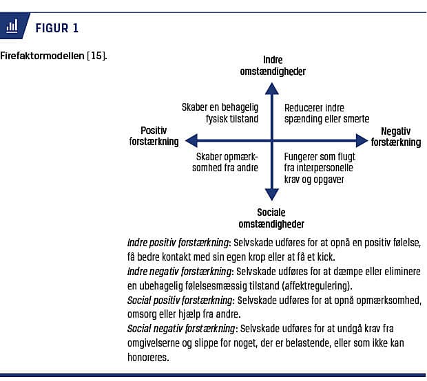 Selvskadens funktion kan forklares ud fra to dimensioner: 1) om selvskadens effekt opstår automatisk som følge af psykologiske eller fysiologiske processer hos individet, eller 2) om selvskadens effekt udløses socialt i samspil med andre. Desuden skelnes der mellem positiv og negativ forstærkning [16] (Figur 1).