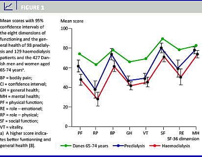 Oplevelse af begrænsning i alment helbred og funktionsevne var større blandt deltagerne i undersøgelsen end i den generelle danske befolkning. Alment helbred og funktionsevne var særligt belastede blandt deltagere, der havde diabetes som grundsygdom, men også hæmodialysebehandling og stigende alder påvirkede aspekter af funktionsevnen negativt. Blandt patienter i prædialysestadiet, der var under 65 år, var 57% i arbejde; blandt patienterne i hæmodialyse var den tilsvarende andel 16%. Den overvejende del af deltagerne i hæmodialysebehandling, der ikke var i arbejde, angav helbred som årsag til ikke at kunne arbejde (77%) mod mindre end halvdelen blandt patienterne, der var i prædialysestadiet (39%). I alt modtog 33% hjemmehjælp, 25% hjemmesygepleje og 10% træning ved fysioterapeut eller ergoterapeut.