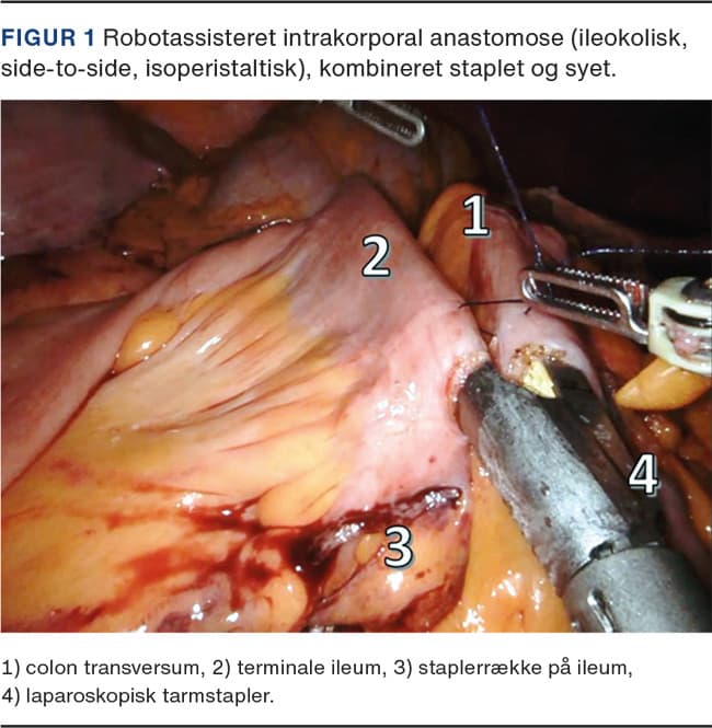 En 65-årig mand med nyopdaget dissemineret prostatacancer samt nyopdaget cancer i colon ascendens blev indlagt til elektiv højresidig hemikolektomi. Patienten havde ingen anden komorbiditet. Han fik foretaget en robotassisteret højresidig hemikolektomi med intrakorporal anastomose (ileokolisk, side-to-side, isoperistaltisk, kombineret staplet og syet) (Figur 1). Fraset en mindre ikkebehandlingskrævende frisk blødning per rectum på andet postoperative døgn var der ikke komplikationer i forbindelse med operationen og det postoperative forløb. Patienten blev udskrevet i velbefindende på tredje postoperative døgn. Histopatologien viste T3N0V0M0, og der var ikke indikation for adjuverende kemoterapi for coloncanceren.
