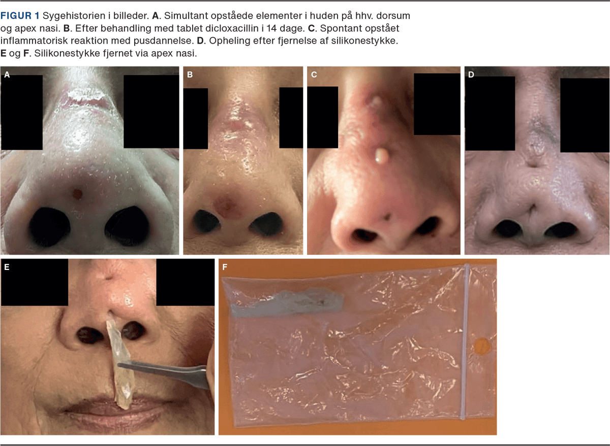 I almen praksis havde podning fra næseryggen til dyrkning og resistensbestemmelse været uden vækst, og behandling med tablet dicloxacillin 1 g × 4 i 14 dage havde kun givet marginal bedring (Figur 1 B). Excisionsbiopsi foretaget i plastikkirurgisk regi fra dorsum nasi og stansebiopsi fra apex nasi viste inflammation uden tegn på fremmedlegemereaktion eller malignitet. Anamnestisk fremgik det, at patienten 43 år forinden havde fået foretaget rinoplastik. Da patienten blev set på dermatologisk afdeling, havde hun i mellemtiden haft spontan forværring med rødme og pusdannelse fra to punkter på dorsum nasi (Figur 1 C) med efterfølgende fremkomst af et silikonestykke i apex nasi. Patienten fjernede da selv et ca. 3 × 0,5 × 0,3 cm stykke fast silikone fra sårdannelse på apex nasi (Figur 1 F). Klinisk sås postinflammatorisk hyperpigmentering i dorsum nasi og to punktformende områder med substanstab på hhv. apex nasi og cartilago septi nasi. UL-skanning af næsen viste proksimalt på dorsum nasi et skyet område i subcutis, hvilket blev tolket som resterende silikone i næseryggen. Patienten havde ikke yderligere gener og ønskede ikke behandling. Ved efterfølgende gennemgang fandt patienten kvitteringen for sin rinoplastik, hvor det fremgik, at hun blev behandlet med et fast silikoneelastomerimplantat (Silastic implant) på en privat klinik i Australien i 1981.