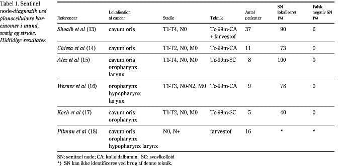 Anvendelse af SN-biopsi ved planocellulære karcinomer ved hoved- og halscancer er endnu under udvikling, og der findes indtil videre kun få publicerede studier med et begrænset antal selekterede patienter med overvejende orale cancere (Tabel 1 ). Ved disse er SN enten identificeret ved brug af isotopteknik alene, isotopteknik og farveteknik i kombination eller alene ved brug af farveteknik. I Danmark behandles der årligt ca. 180 tilfælde af orale cancere.