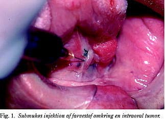 Metoderne til fjernelse af SN, SN-biopsi, er forskellige (Tabel 1). Shoaib et al (http://www.canniesburn.org - sept. 2001) anbefaler på baggrund af deres tidligere opnåede erfaringer følgende metode: Ved operationens indledning og efter at patienten er blevet bedøvet, foretages injiceringen af farvestoffet omkring tumoren (Fig. 1 ). Der foretages dernæst en passende incision på halsen, således at denne incision kan forlænges, hvis det skulle vise sig nødvendigt i en senere seance at foretage en halsglandelexairesis (13, 20).