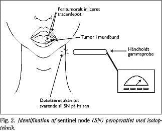 Lokalisationen af SN er forudgået af injektion af radioaktivt mærkede partikler (kolloider), som dagen før operationen (13, 14) eller nogle timer inden operationen (17), er blevet injiceret peritumoralt i mucosa og submucosa i mundhulen eller svælget. Kolloidet optages i det retikuloendoteliale system, hvor det vil lejres i de(n) første lymfeknude(r) på halsen, som er tumordrænerende (19). Efter injektionen foretages der mundskylning for at forhindre ansamling af kolloid eller synkning af dette. SN identificeres efterfølgende ved brug af lymfescintigrafi ved enten statisk (13, 14) eller dynamisk billedoptagelse (17). Ud fra de scintigrafiske optagelser kan den eller de identificerede SN markeres enten på huden med farve (13, 15, 17) eller indføres på et diagram af patienten (14). Enkelte (15, 16) identificerer SN udelukkende ved brug af gammaprobe under operationen.