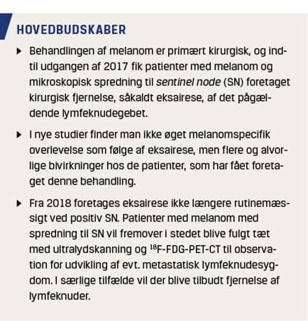 Patienter med melanommetastaser til en eller flere SNs skal ikke længere rutinemæssigt tilbydes eksairese, men i stedet tæt overvågning med ultralydskanning ved hvert kontrolbesøg (hvor der ikke foretages 18F-
