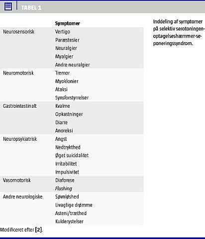 Ophørssymptomer er velbeskrevne for stort set alle større grupper af antidepressiva [1]. Et stort antal symptomer er rapporteret, men disse kan inddeles i overskuelige kategorier, se Tabel 1 . Der er ikke tale om et egentligt afhængighedssyndrom, da patienterne ikke udviser afhængighedskarakteristika som f.eks. craving eller tolerans. Det er således vigtigt at skelne seponeringssyndromet (SS) fra en abstinenstilstand [1-3]. Ydermere er det vigtigt at skelne mellem SS og recidiv af depressionen. SS indtræder -typisk få dage efter seponering af en selektiv serotoningenoptagelseshæmmer (SSRI), mens recidiv oftest indtræder efter et par uger. Nedenstående sygehistorie illustrerer vanskelighederne ved denne differentialdiagnostik.