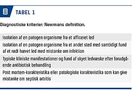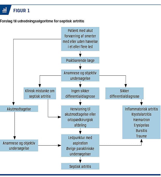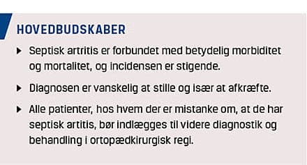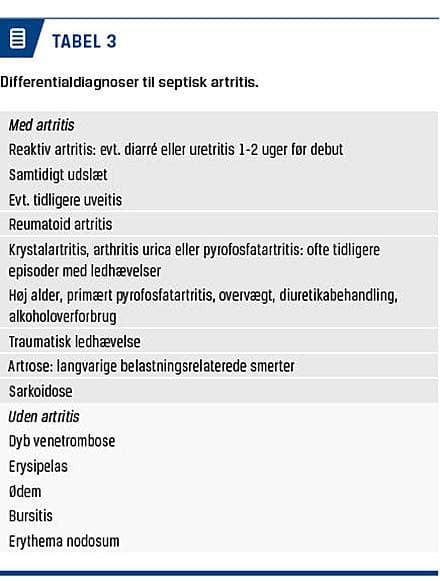 Septisk artritis (SA) er en vigtig differentialdiagnose hos patienter, der har akut opstået monoartikulær eller polyartikulær artritis. Hurtig diagnostik og behandling kan begrænse morbiditet og mortalitet ved SA [1].
