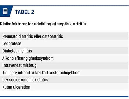 Polyartikulær SA ses oftest hos patienter med betydelig komorbiditet som reumatoid artritis, artrose, diabetes mellitus, intravenøst misbrug, alkoholmisbrug og nyresygdom med dialysebehov samt hos immunsupprimerede patienter [1] (Tabel 2). Hos patienter med reumatologiske ledlidelser kan den kliniske præsentation af SA være særlig svær at erkende. Forudgående inflammation kan maskere tilstanden, og typiske symptomer kan mindskes af immunsupression iværksat i antiinflammatorisk øjemed [1]. Alle patienter, hos hvem der er mistanke om eller diagnosticeret SA, bør udredes for disponerende faktorer til SA.