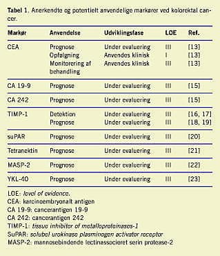Andre serologiske markører kan formentlig også anvendes ved fastlæggelse af prognosen ved KRC. Således anbefaler EGTM, at markørerne CEA, CA 19-9, CA 242 og TIMP-1 evalueres og sammenlignes i fremtidige prospektive protokoller [13]. Tidligere projekter med inklusion af multivariatanalyse har vist, at den prognostiske værdi af CA 19-9 er uafhængig af stadiet og præoperativ koncentration af CEA ved KRC [35]. Baseret på dette og lignende fund anbefaler NACB, at CA 19-9 bliver evalueret i prospektive protokoller med henblik på at bringe værdien op på LOE I [24]. Resultater fra få projekter har vist, at CA 242 formentlig også er en markør, som efter gennemgribende evaluering vil kunne anvendes ved stadieuafhængig fastlæggelse af prognosen ved KRC [36]. TIMP-1 er blandt de serologiske markører, som både NACB og EGTM anbefaler bliver gennemtestet og evalueret både alene og i sammenligning med andre markører [15] med henblik på at bringe evidensen op på LOE I [24]. Hidtil har resultater fra to uafhængige projekter vist, at høj præoperativ koncentration af TIMP-1 i plasma er stadieuafhængigt relateret til dårlig prognose ved KRC [18, 19]. Ved stadium II (Dukes' B)-sygdom blev det således vist, at de 70% af patienterne, der havde de laveste plasmakoncentrationer af præoperativ TIMP-1, havde en overlevelse, der var sammenlignelig med den alders- og kønsmatchede danske befolknings overlevelse, mens de 30%, der havde de højeste plasma-koncentrationer, havde en dårlig prognose [18]. Lignende, men ikke nær så overbevisende resultater blev fundet blandt patienter med stadium III (Dukes' C)-sygdom. Resultaterne tyder på, at det i fremtiden måske bliver muligt stadieuafhængigt at skelne mellem de patienter, som efter operation bør tilbydes systemisk adjuverende terapi, som f.eks. kemoterapi, og dem, som ikke bør. Andre nye serologiske markører er plasmaurokinase plasminogenactivatorreceptor (suPAR), serumtetranectin og serummannosebindende lectin (MBL)-associeret serinprotease-2 (MASP-2). Disse markører er i præoperative prøver vist at have stadieuafhængig prognostisk værdi [20-22] og bør derfor evalueres som enemarkører eller i kombination med f.eks. TIMP-1 og/eller CEA.