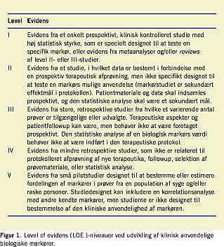 Formålet med denne oversigt er at gennemgå litteraturen om udvalgte serologiske, biologiske markører ved KRC, evaluere disse markører og endelig komme med rekommandationer for fremtidig anvendelse. Gennemgangen foretages med fokus på detektion, prognose, opfølgning og monitorering. Nogle af de mest interessante biologiske markører er vist i Tabel 1 , hvor evidensniveauet (level of evidence - LOE) [24] (Figur 1 ) samtidig er anført. Tabel 2 viser hidtidige rekommandationer for anvendelse af biologiske markører ved KRC.