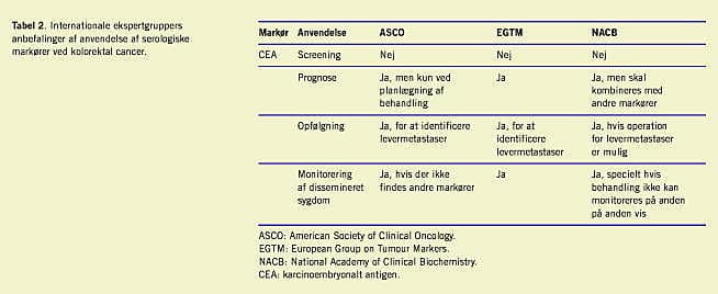 Mulighederne for fornyet, intenderet kurativ intervention øges, jo tidligere recidiverende sygdom opdages. Derfor er der udtalt behov for implement ering af metoder til opfølgning efter den primære operation, således at recidiv kan detekteres så tidligt som muligt. Den eneste anerkendte serologiske markør til denne anvendelse er CEA, som på dette område har nået LOE I (Tabel 2). Værdien af CEA understreges af resultater fra metaanalyser [37, 38], som viser, at overlevelsen forbedres mere hos patienter, som overvåges med serielle CEA-målinger, end hos patienter, som tilbydes standardopfølgning uden CEA-måling. Derfor anbefaler EGTM [13], at serum-CEA implementeres ved KRC. Konkret anbefales det, at markøren bestemmes hver anden/tredje måned hos patienter, som har stadium II eller III og er mulige kandidater til operation for metastaser til leveren. Pga. den lave frekvens af recidiv ved stadium I-sygdom anbefales der ingen opfølgning af disse patienter. Imidlertid differentieres EGTM's anbefalinger af NACB, som fremhæver, at man med postoperativ serum-CEA kun finder ca. 70% af de patienter, som får recidiv [39]. Derfor må kliniske symptomer sammen med en normal CEA-koncentration ikke afholde klinikeren fra at fortsætte en minutiøs udredning. Bl.a. på denne baggrund anbefaler ASCO, at der gennemføres forskning, som kan identificere mere effektive og nøjagtige biologiske markører [7].
