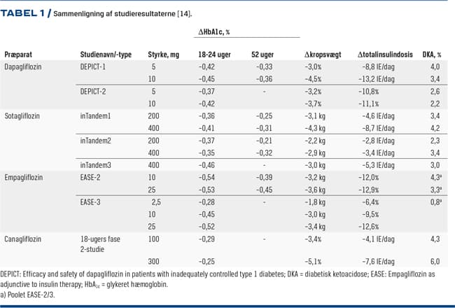 Formålet med SGLT2-hæmmerne i behandlingen af T1D er i første omgang et ønske om at bedre den glykæmiske regulering, som vist i de kliniske studier. Det er vigtigt at være opmærksom på den øgede risiko for DKA, der kan være vanskelig at identificere pga. nærnormalt blodglukoseniveau. De kliniske studier har vist en øget forekomst af DKA, men der har kun været en enkelt episode med dødelig udgang. Hvis man kan eftervise den gavnlige effekt på hjerte- og nyresygdom, som er set ved T2D, vil det øge betydningen af denne behandlingsmulighed. Desværre mangler der endepunktsstudier til afklaring af effekter af disse komplikationer, som der p.t. ikke findes en effektiv behandling af ved T1D.