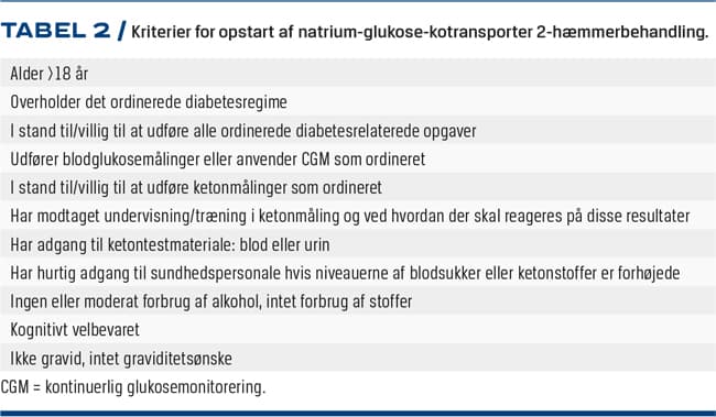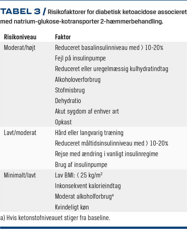 På en international konsensuskonference i 2019 blev der udarbejdet anbefalinger for brug af SGLT2-hæmmere hos personer med T1D [11]. I anbefalingerne for påbegyndelse af behandlingen blev normale niveauer af ketonstoffer (< 0,6 mmol/l blodketoner, negative urinketoner) fremhævet som det helt essentielle (Tabel 2). Risikofaktorer for udvikling af DKA under behandlingen blev inddelt efter risikoniveauer. Disse kan ses i Tabel 3.