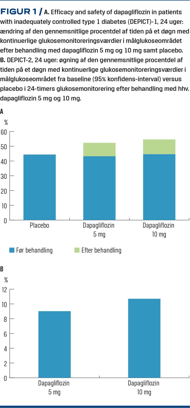 Efficacy and safety of dapagliflozin in patients with inadequately controlled type 1 diabetes (DEPICT)-1 og -2 studierne, hvor man vurderede effekten af dapagliflozin mod placebo, ligger til grund for godkendelse af dapagliflozin 5 mg eller 10 mg dagligt. Studierne består af DEPICT-1, 24 uger (n = 778), DEPICT-1, 52 uger (n = 708) og DEPICT-2, 24 uger (n = 728). Her viste dapagliflozin sig sammenlignet med placebo at have effekt som tillæg til intensiveret insulinbehandling med en reduktion i det primære endepunkt: niveauet af glykeret hæmoglobin A1c (HbA1c), på ca. 4,4 mmol/mol efter 6 mdr. og ca. 3,3 mmol/mol efter 12 mdr. Dertil sås et vægttab på 3,2% efter 6 mdr. og 3,5% efter 12 mdr. sammenlignet med et vægttab med placebo på 0,1% og en reduktion af insulindosis over døgnet på 11% sammenlignet med 8% i placebogruppen (p < 0,0001 for alle) [1, 8, 9, 11]. Samtidig sås der en forbedring af time in range (andelen af tid på et døgn, hvori blodglukoseniveauet befinder sig i området 3,9-10,0 mmol/l) målt med kontinuerlig blodsukker-sensor. DEPICT-1-studiet på 24 uger viste en forbedring fra 43,2% (standard deviation (SD): 12,4) til 52,3% (SD: 14,8) og fra 44,6% (SD: 12,4) til 54,6% (SD: 13,1) ved behandling med hhv. 5 mg og 10 mg dapagliflozin. DEPICT-2 studiet på 24 uger viste en øgning fra baseline ved behandling med dapagliflozin versus placebo i time in range på 9,0% (95% konfidens-interval (KI): 6,97-11,06%; p < 0,0001) og 10,7% (95%-KI: 8,66-12,74%; p <0,0001) for dapagliflozin 5 mg og 10 mg (Figur 1A og B). Behandlingen var ikke associeret med øget tid i det hypoglykæmiske range (< 3,9 mmol/l) i nogen af studierne [1, 9]. For sotagliflozin viste inTandem3-studiet på 24 uger, at en signifikant større andel af patienter i sotagliflozingruppen versus placebogruppen opnåede det primære endepunkt med HbA1c-niveau< 53 mmol/mol ved uge 24 uden alvorlig hypoglykæmi eller ketoacidose efter randomisering (28,6% vs. 15,2%, p < 0,001). Ændringen fra baseline var signifikant større i sotagliflozingruppen end i placebogruppen for HbA1c-niveau(–0,46 procentpoint), vægt (–2,98 kg), systolisk blodtryk (–3,5 mmHg) og gennemsnitlig daglige insulindosis (–5,3 enheder pr. dag) [2]. Empagliflozin as adjunctive to insulin therapy (EASE)-studierne med EASE-2 studiet på 52 uger og EASE-3 studiet på 26 uger viste lignende resultater med et fald i HbA1c-niveau på 3,1 mmol/mol, 5,9 mmol/mol og 5,8 mmol/mol for hhv. 2,5 mg, 10 mg og 25 mg (p < 0,0001 for alle) uden øget forekomst af hypoglykæmi (bekræftet blodglukoseniveau < 3,0 mmol/l og/eller alvorlig hypoglykæmi, som krævede assistance fra tredjepart), et signifikant vægttab (1,8/3,0/3,4 kg), signifikant forbedring af time in range med en øgning på hhv. 1,0/2,9/3,1 time/dag (p < 0,0001 for 10 og 25 mg), signifikant reduktion af insulindosis over døgnet på –6,4/–13,3/–12,7% og signifikant reduktion i systolisk blodtryk på 2,1/3,9/3,7 mmHg [11, 12]. For canagliflozin viste et dobbeltblindet, randomiseret fase 2-studie på 18 uger, at flere patienter havde en reduktion af HbA1c-niveaupå 4,4 mmol/mol uden vægtøgning ved behandling med canagliflozin 100 mg og 300 mg versus placebo (p < 0,001) uden øget forekomst af hypoglykæmi. Dertil var der en reduktion i den totale insulindosis på 8,9% og 12,9% ved behandling med hhv. 100 mg og 300 mg [13]. Sammenligningen af resultaterne for ovennævnte studier kan ses i Tabel 1.