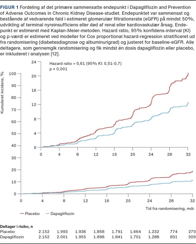 Senest har nyrestudiet DAPA-CKD med 4.304 deltagere med proteinurisk CKD (eGFR: 25-75 ml/min/1,73 m2 og UACR: 200-5.000 mg/g) vist gavnlig effekt af SGLT2i på progression af nyrefunktion både hos deltagere med og uden diabetes [12]. Der var effekt på 32% af deltagerne, som havde ikkediabetisk nyresygdom, med en 50% risikoreduktion, både på det kombinerede primære og de sekundære endepunkter (Figur 1). Fald i eGFR mellem baseline og 30 mdr. var lavere i behandlingsgruppen med en forskel mellem grupperne på 0,96 ml/min/1,73 m2 pr. år (95% konfidens-interval (KI): 0,61-1,25). Efter korrektion for det initiale fald i eGFR i behandlingsgruppen øgedes forskellen til 1,92 ml/min/1,73 m2 pr. år (95% KI: 1,61-2,24). Især hos de 270 deltagere med IgA-nefropati sås en bemærkelsesværdig risikoreduktion på 71% for det primære endepunkt i forhold til placebo [13].