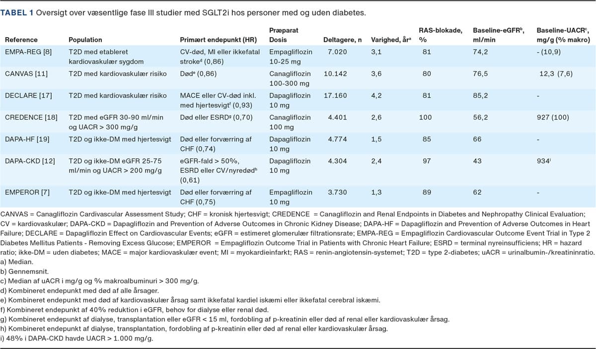 De væsentligste studier er resumeret i Tabel 1. CREDENCE-studiet [18] var det første, der undersøgte SGLT2i-behandling i en T2D-population med CKD med en estimeret glomerulær filtrationsrate (eGFR) på 30-90 ml/min/1,73 m2, en urinalbumin-/kreatininratio (UACR) på 300-5.000 mg/g ved baseline og med et primært endepunkt fokuseret på progression af nyresygdom. Studiet viste en 30% risikoreduktion i det primære sammensatte endepunkt (terminalt nyresvigt, fordobling af p-kreatininniveau eller død af nyre- eller kardiovaskulær årsag). Hos de 174 deltagere med eGFR < 30 ml/min/1,73 m2 ved baseline havde behandlingen samme effekt og sikkerhedsprofil som i den øvrige population [20].
