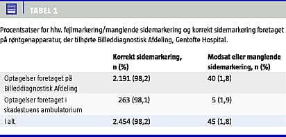 Summary Side annotations on X-rays are not always correct Ugeskr Læger 2011;173(15):1128-1129 R and L annotations on X-rays are important! Is it done? A quality assurance project from an X-ray department in Gentofte Hospital, Copenhagen, focuses on right and left annotations on conventional, digital X-rays. Included images were those of greater joints and extremities pre and post surgery, and controls after minor emergency injuries. The sum of included images was 2499, and the error level was 1.8%. Annotations are the radiographer's obligation and can be forgotten. Factors like stress, interruptions, different equipment or amnesic patients play a role. No available, comparable studies have been found.