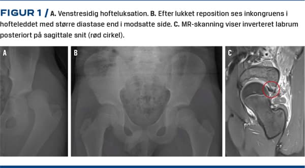 II. En 11-årig dreng styrtede på en motocrosscykel, hvor han kastedes over styret. Han blev indbragt som traumepatient på et regionshospital, hvor man på røntgenbilleder og traume-CT konstaterede traumatisk posterior hofteledsluksation (Figur 1A). Hofteledsluksationen reponeredes akut på traumestuen. Efter repositionen sås der øget diastase i hofteleddet (Figur 1B). Resultaterne af en MR-skanning på andendagen gav mistanke om interponeret posterior labrumlæsion (Figur 1C). Patienten blev overflyttet til behandling på en højtspecialiseret børneortopædisk enhed.