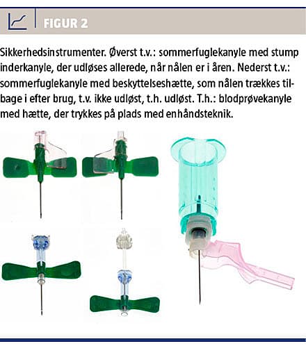 instrumenter var 74% lavere for sikkerhedsinstrumenter end for konventionelle instrumenter (11,1 vs. 2,9 stikskader pr. 100.000, p < 0,001). Samtidig sås et fald i den procedurerelaterede risiko for blodprøvetagning, arteriepunktur, injektion, indsætning af pvk’er og træk på sommerfuglekanyler på 75% fra 1990 til 2000, hvilket var stærkt korreleret til øget brug af sikkerhedsinstrumenter.