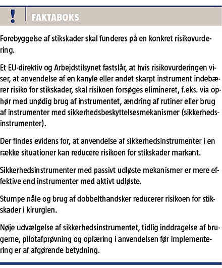 I artiklen gøres der rede for evidensen for den forebyggende effekt på hyppigheden af stikskader ved brug af sikkerhedsinstrumenter og vigtige forholdsregler i forhold til valg og implementering.
