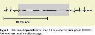 Patienten var en 63-årig mand, som igennem 43 år havde haft tilfælde af palpitationer, synkoper og nærsynkoper. Han blev frem til 1995 fulgt hos en speciallæge i kardiologi og fra 1998 i kardiologisk ambulatorium for paroksystisk atrieflimren. Man har igennem årene behandlet med betablokker, calciumantagonist og senest flecainid. Under flecainidbehandlingen udvikledes der bifascikulært grenblok. Under forløbet blev patienten nøje udredt, og man fandt normale elektrolytter, normal ekkokardiografi samt normale forhold ved arbejds-elektrokardiogram (EKG) og myokardiescintigrafi. Gentagne holtermonitoreringer viste episoder med selvlimiterende atrieflimren, men ingen pauser i hjerterytmen. Da patienten var meget utryg ved sin situation blev han indlagt til seponering af antiarytmisk medicin under telemetriovervågning. I forbindelse med indlæggelsen foretog man carotismassage. Patienten fik herunder en 11 sekunders pause i hjerterytmen (Figur 1 ), recidiv af symptomerne og kortvarigt bevidsthedstab. Diagnosen sinus caroticus-syndrom blev således stillet efter 43 år. Patienten fik implanteret en pacemaker, og siden har der ikke været synkoper.