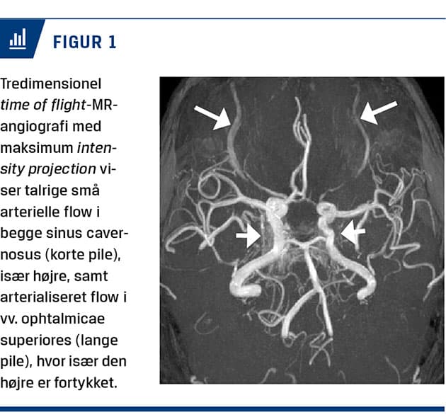 En 57-årig kvinde, der havde posttraumatisk stress-syndrom og tidligere havde haft to lette hovedtraumer, oplevede gennem to måneder intermitterende episoder med op til ti daglige opkastninger ledsaget af »skrig i hovedet«. Symptomerne debuterede i forbindelse med hendes mors død. Kvindens egen læge tolkede initialt symptomerne som belastningsbetingede og udskrev anxiolytika. Der tilkom akut binokulært horisontalt dobbeltsyn, højresidigt sløret syn, retrobulbær og occipital hovedpine, kvalme samt svimmelhed, og hun blev indlagt. Objektivt fandt man ptose og middelstor trægtreagerende pupil på højre side, divergerende øjenakser samt usikker linjegang. En CT af cerebrum viste ingen akutte forandringer. Patienten blev indlagt på et apopleksiafsnit på mistanke om iskæmisk hjernestammeinfarkt og behandlet med trombocythæmmere. Telemetri viste sinusrytme, resultatet af standardbiokemisk undersøgelse var normalt, og hun havde ingen kardiovaskulære risikofaktorer. En MR-angiografi viste tegn på bilaterale karotiko-kavernøse fistler med talrige arterielle flow især i højre sinus cavernosus samt arterialiseret flow i vv. ophtalmicae superiores, hvor især den højre var fortykket (Figur 1). Auskultation af kraniet afslørede en højresidig occipital mislyd. Patienten fik foretaget en digital subtraktionsangiografi (DSA), hvorved man kunne bekræfte en kompleks bilateral karotiko-kavernøs fistel født fra begge aa. carotides internae og externae med drænage til vv. ophtalmicae superiores, sinus petrosus inferiores og venstre sinus petrosus superior. Fistlerne blev okkluderet med coils ved endovaskulær terapi.