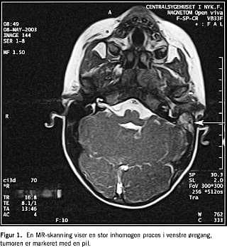 En MR-skanning (Figur 1 ) viste en stor inhomogen proces i meatus acusticus externus sin., ødem i tuba auditiva sin., m. pterygoideus medialis og lateralis sin. samt let ødem i mellemøret.