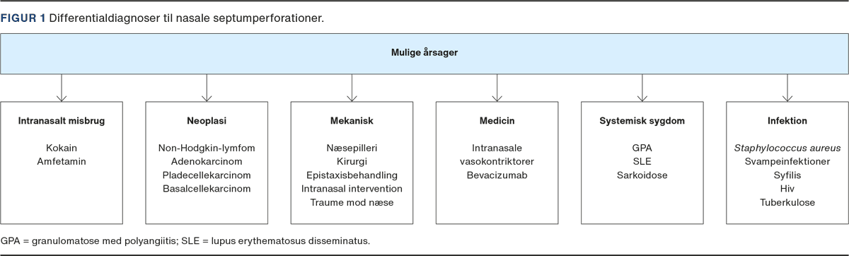 Da patienter ikke altid er ærlige om deres kokainmisbrug, er det vigtig at kende til differentialdiagnoser til nasale septumperforationer. Overordnet opdeles årsagerne efter ætiologi illustreret i Figur 1 [12, 13].