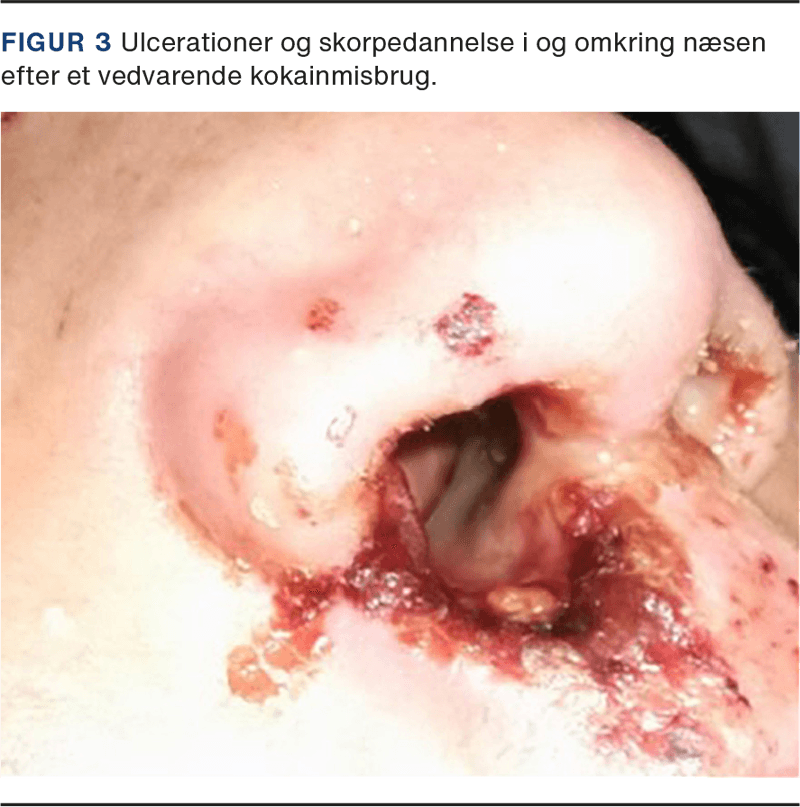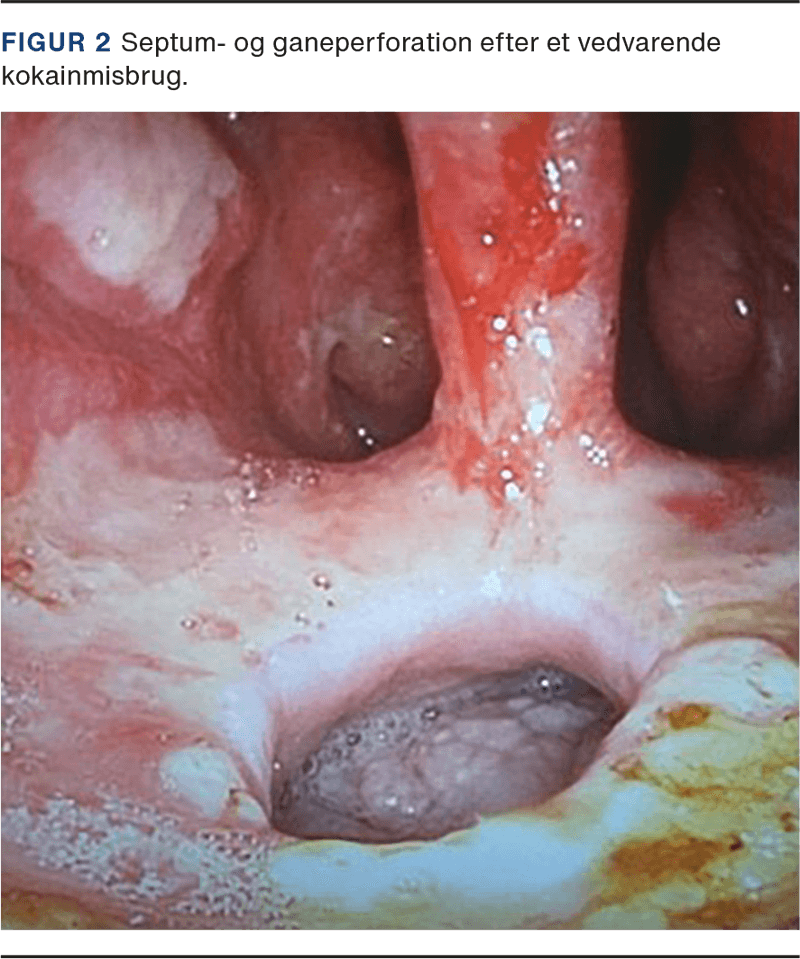 Forbruget af kokain i Danmark har været stigende de seneste 10 år og betragtes ikke længere som et »jetsetfænomen«, men er efterhånden vidt udbredt i alle socioøkonomiske klasser [1-5]. Kokain er et stærkt afhængighedsskabende stof, der ofte indtages for at opnå en følelse af eufori, øget energi og selvtillid. Det bruges hovedsageligt i nattelivet sammen med alkohol, hvor kokain gør det muligt for brugeren at forblive energisk og vågen trods en høj alkoholpromille. Stoffet kan indtages gennem næsen ved snifning, ryges eller injiceres. Indtagelse kan udløse en række akutte bivirkninger, herunder karkonstriktion, der fører til forhøjet blodtryk, iskæmiske hjertesmerter, kramper, angst og paranoia [6, 7]. Ved længere tids nasal snifning af kokain sker der en markant nedsat vaskularisering, hvilket kan føre til destruktive bivirkninger på den nasale struktur, hvor næseskillevæggen oftest påvirkes, men stort set alle strukturer i mellemansigtet kan involveres [8-10]. Tilstanden kaldes i litteraturen »cocaine-induced midline destructive lesions« (CIMDL). Disse patienter har ofte med skorpedannelse, smerter, fløjtende nasal respirationslyde, nedsat lugtesans eller nasal obstruktion. Patienter med denne tilstand kan være svære at behandle, da det kræver total kokainafholdenhed, for at en kirurgisk intervention kan forsøges [8, 9]. Formålet med denne artikel er at gennemgå, hvilke behandlingstilbud der findes til patienter, som viser sig med denne tilstand, og hvilke problemstillinger der er i den forbindelse.