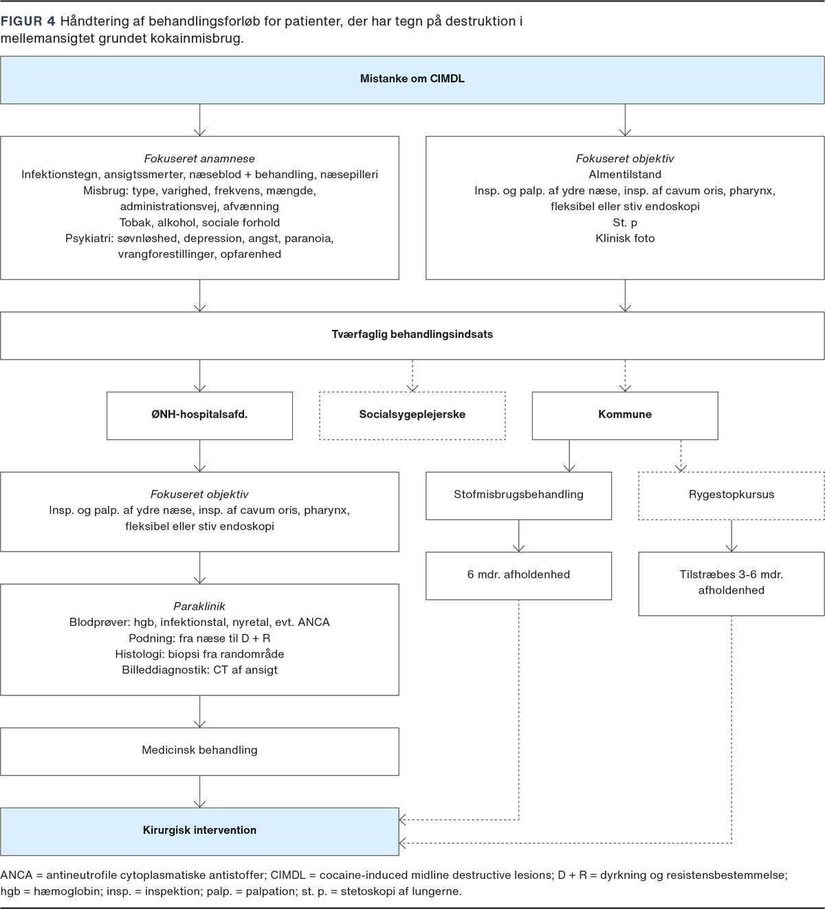 I Figur 4 gives et forslag til håndtering af behandlingsforløb for patienter, der har tegn på destruktion i mellemansigtet grundet kokainmisbrug, fra primær sektor til sekundær sektor. Den parakliniske del er primært forbeholdt øre-næse-hals (ØNH)-praksis eller -hospitalsafdeling. En fuld undersøgelse af patienten skal ikke indeholde alle elementer, men skal ses som en huskeliste og hjælp til at vælge de undersøgelser, der kan hjælpe med at sandsynliggøre eller afkræfte de mistænkte diagnoser. F.eks. kan den kliniske præsentation af CIMDL og granulomatose med polyangiitis (GPA) ligne hinanden. De fleste patienter med CIMDL tester positive for antineutrofile cytoplasmatiske antistoffer (ANCA), præcis ligesom patienter med GPA er det, hvilket kan vanskeliggøre diagnosticeringsprocessen [11]. Anamnesen kan således være afgørende i udredningen.