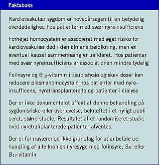 Der er dokumentation for en association mellem forhøjet plasmahomocystein og kardiovaskulær sygdom i den almene befolkning. Hvorvidt denne sammenhæng er kausal, er uafklaret, om end der i eksperimentelle studier er fundet mulige patofysiologiske mekanismer. Sammenhængen mellem homocystein og risiko hos terminalt nyresyge er mere usikker og påvirkes antageligt af faktorer som kronisk dårlig ernæring og inflammation. Det er overbevisende påvist, at behandling med folinsyre og formodentligt også B12 -vitamin kan reducere plasmahomocystein hos nyreinsufficiente patienter. Den optimale dosis er uafklaret, men i de fleste undersøgelser ses der maksimal effekt af 1-5 mg folinsyre dagligt. Der er imidlertid ikke dokumentation for en morbiditets- eller mortalitetsreducerende effekt af en sådan behandling, hvilket nu er bekræftet i et større, randomiseret studie (HOST), hvori man undersøgte effekten af en kombination af folinsyre, B6 og B12 . På den baggrund er der på nuværende tidspunkt ikke grundlag for at anbefale behandling af alle kronisk nyresyge med folinsyre, B6 - eller B12 -vitamin. Et større studie med nyretransplanterede patienter er på vej. Det er fortsat uafklaret, om der er subgrupper af nyresyge, der f.eks. på baggrund af vitaminstatus og/eller genetiske polymorfier måske vil have gavn af vitaminsubstitution. Det skal understreges, at ovenstående naturligvis ikke diskvalificerer behandling af regulær vitaminmangel, klinisk eller biokemisk hos nyresyge. Denne diagnose kan være vanskelig, specielt når det gælder B12 -vitamin-mangel, da de diagnostiske kriterier, herunder homocystein, er påvirket af nyreinsufficiensen i sig selv. Med dette som udgangspunkt, og da vitaminerne er vidtgående ugiftige og uden bivirkninger, kan man overveje at anbefale et »almindeligt« dagligt B-vitamin-tilskud. Der er ikke klinisk dokumentation herfor, og man skal i givet fald erindre, at peroral behandling ikke forebygger vitaminmangel hos alle patienter.