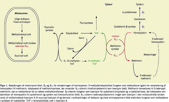 Folat, B6-vitamin (pyridoxin) og B12-vitamin (cobalamin) tilhører gruppen af vandopløselige B-vitaminer. Alle spiller en væsentlig rolle for omsætningen af homocystein (Figur 1 ). Methyltetrahydrofolat og methylcobalamin indgår begge i remetyleringen af homocystein til methionin, mens B6-vitamin fungerer som koenzym for omdannelsen af homocystein til cystathionin og cystein. Methionin konverteres til S-ade-nosylmethionin og fungerer som methyldonor for en række methyltransferaser. Mangel på såvel folat som B6- og B12-vitamin fører til akkumulation af homocystein, mens B12-vitaminmangel tillige fører til forhøjede koncentrationer af methylmalonylsyre (MMA), et nedbrydningsprodukt af methylmalonyl-koenzym A. Opgørelser i ældrepopulationer viser, at omkring to tredjedele af de tilfælde, hvor der er forhøjet homocystein, kan forklares ved mangel på vitaminerne folat og B12 [2]. Forhøjet homocystein er endvidere associeret med nyreinsufficiens, polymorfier i genet for methylentetrahydrofolatreduktase og defekter i enzymer, der indgår i transsulfuration [2].