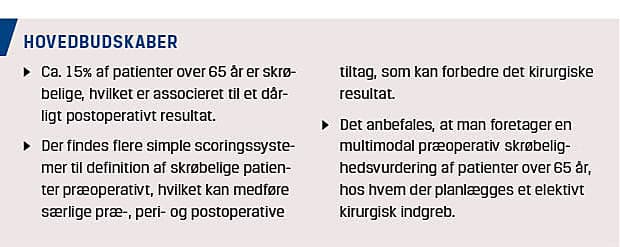 Målet med denne artikel er at definere begrebet skrøbelighed, beskrive scoringssystemer, som kan bruges til identifikation af skrøbelige patienter, og belyse, hvilke præ-, peri- og postoperative tiltag der kan nedsætte antallet af komplikationer hos skrøbelige patienter.