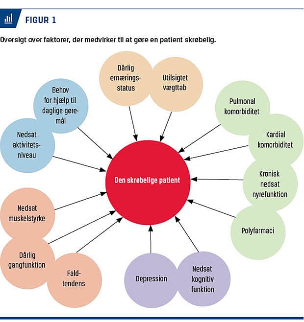 Skrøbelige patienter har en forøget risiko for postoperativ morbiditet og mortalitet. Skrøbelighed påvirkes af mange faktorer heriblandt kognitivt og fysisk funktionsniveau, ernæringsstatus og komorbiditet (Figur 1). Der findes flere simple værktøjer til skrøbelighedsvurdering af patienter, og i værktøjerne inddrages et udvalg af disse faktorer, men der mangler fortsat ét »guldstandardscoringssystem«. I USA anbefales det nu, at alle elektive kirurgiske patienter over 65 år skrøbelighedsvurderes. At sikre det bedst mulige operationsforløb for skrøbelige patienter er en multidisciplinær opgave [26], men hvilke præoperative tiltag der er mest hensigtsmæssige i forhold til at bedre patienternes postoperative forløb, er endnu uklart.