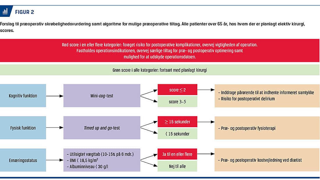 Baseret på litteraturen anbefales det, at man foretager en multimodal præoperativ skrøbelighedsvurdering af patienter over 65 år, hos hvem man planlægger et større kirurgisk indgreb. Baseret på litteraturen foreslås det, at en skrøbelighedsvurdering inkluderer en vurdering af kognitiv funktion, fysisk funktionsniveau og ernæringsstatus (Figur 2).