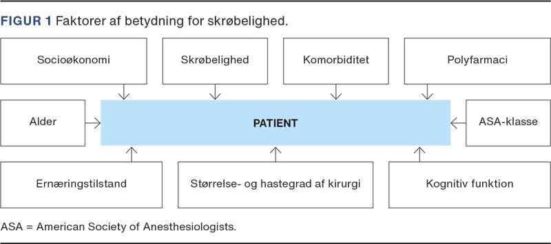 I 1941 introducerede American Society of Anesthesiologists, ASA, et klassifikationssystem til vurdering af patienters præoperative helbred [3]. Det er løbende modificeret for at forbedre dets anvendelighed i risikovurderingen. En patient uden sygdomme vurderes i ASA-klasse I, velbehandlet hypertension rubriceres eksempelvis som ASA-II, hvis tilstanden anses med mild systemisk påvirkning. Patienter med sygdomme, der giver anledning til sværere systemisk påvirkning, anses som ASA III, en patient med livstruende systemisk sygdom eller en moribund tilstand klassificeres som ASA IV-ASA V. ASA-klassifikationen er mangelfuld, idet den ikke tilstrækkeligt adresserer en række faktorer såsom funktionsniveau, komorbiditet, ernæringsstatus, medicin, kognitiv funktion og socio-økonomiske omstændigheder, som alle har betydning for det perioperative forløb, Figur 1.