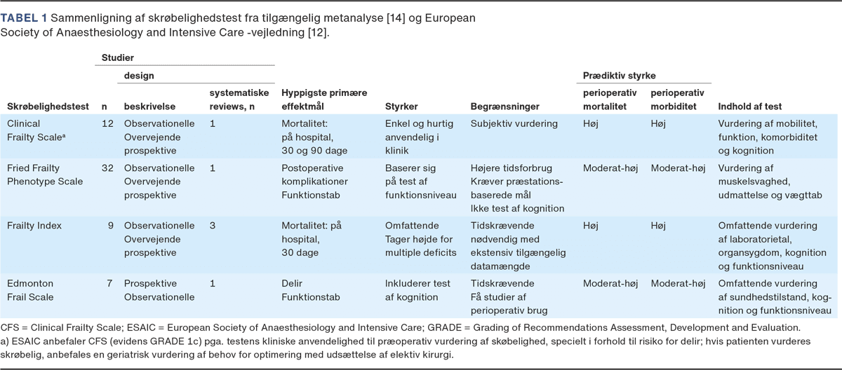 Dansk Kvalitetsdatabase for Ældre med Skrøbelighed (DANFRAIL) anbefaler CFS-scoren til vurdering af skrøbelighed [11]. Ved hjælp af en nem oversigt for patientens fysiske og kognitive evner kan patienten gives en score fra 1-9, hvor et er patienter, som anses som robuste, aktive og motiverede, mens en score på ni gives patienter, som anses at nærme sig livets afslutning. European Society of Anaesthesiology and Intensive Care (ESAIC) har sammenlignet CFS, Fried Frailty Phenotype Scale og Edmonton Frailty Scale i vejledning for præoperativ vurdering [12]. ESAIC-vejledningen konkluderer, at CFS har den højeste grad af gennemførlighed, efterfulgt af Edmonton Frailty Scale, hvorimod Fried Frailty Phenotype Scale synes mindre brugbart i en klinisk kontekst, da dette værktøj vil kræve ekstra udstyr og er mere tidskrævende. Resultatet af et prospektiv multicenterkohortestudie viser, at CFS i højere grad kan forudsige forekomsten af postoperative effektmål, som f.eks. død og indlæggelsesvarighed sammenlignet med Fried Frailty Phenotype og Frailty Index [13].