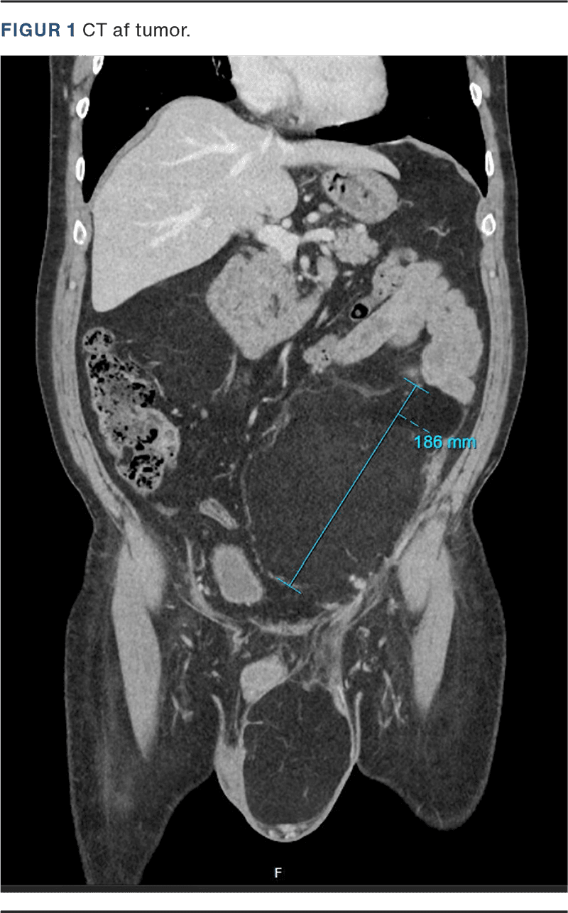 Patienten blev udredt med CT, hvor man fandt en stor tumor i venstre hemiskrotum samt i retroperitoneum. Tumoren kommunikerede via ingvinalkanalen og strakte sig op mod venstre nyre (Figur 1).