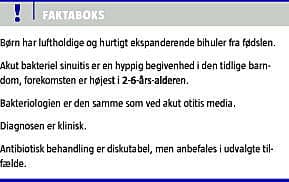 Bevisbyrden for sygdommens klinik, mikrobiologi og behandling hviler i høj grad på arbejder fra den samme forskergruppe gennem tre årtier, og en validering fra andre grupper ville være ønskværdig - ideelt set med en belysning af danske forhold. Ligeledes ville det være kærkomment, om der kunne udvikles en bedside -diagnostik á la Strep A-test, som pålideligt kunne skelne en bakteriel sinuitis fra en viral og dermed forhindre unødvendig behandling. Effekten af antibiotisk behandling er utilstrækkeligt belyst, men evidensen hælder mod en effekt. Risikoen for alvorlige komplikationer hos i øvrigt raske børn er for lille til i sig selv at retfærdiggøre antibiotisk behandling. Vi tilslutter os anbefalingen om at begrænse antibiotisk behandling af AS til sværere tilfælde samt ved komplikationer eller komorbiditet, herunder eventuelt til børn med akut eller dårligt kontrolleret astma. Da der ikke findes evidens for behandling i mindre end ti døgn, kan vi ikke give anbefalinger vedrørende kortere behandlingstid. Den antibiotiske behandling ser ud til at være mere effektiv ved tillæg af nasalsteroid, der til gengæld ikke anbefales som monoterapi til mindre børn.