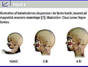Bihulernes udvikling er billeddiagnostisk dokumenteret. Etmoidcellerne er luftholdige ved fødslen. Det samme gælder sinus maxillaris, der ved termin har et rumfang på 0,08 cm3 og som ekspanderes hurtigt i de første leveår, så rumfanget i toårsalderen er 1 cm3 og i fireårsalderen 2,7 cm3 (Figur 1 ) [7]. Sinus sphenoidalis er ikke luftholdig ved fødslen, men ekspanderes ligeledes hastigt i de første leveår. Sinus frontalis indeholder ved fødslen kun rød knoglemarv og kan først visualiseres fra 5-6-årsalderen. Mellemørerne er forbundet med nasopharynx via det eustatiske rør og kan patoanatomisk betragtes som de to mindste bihuler [5].