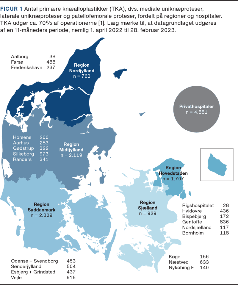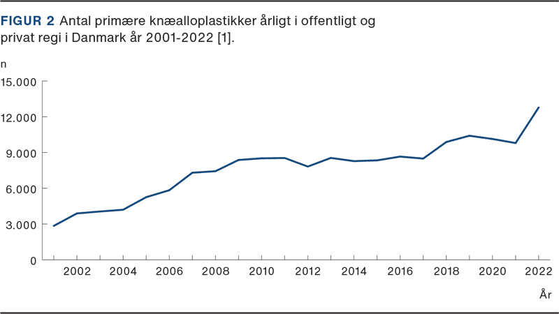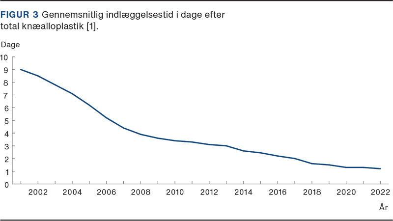 Total knæalloplastik (TKA) er en hyppigt udført ortopædkirurgisk procedure (Figur 1). I 2022 blev der i Danmark udført over 12.000 primære knæalloplastikker, hvoraf TKA-operationer udgjorde ca. 70%, og den generelle udvikling går i retning mod flere operationer og kortere indlæggelsestid (Figur 2) [1]. Der er i Danmark fokus på fast track-TKA-forløb, og indlæggelsestiden er i dag reduceret markant [2]. Patienter udskrives nu i gennemsnit efter 1,2 døgn, en betydelig del opereres om morgenen og udskrives samme eftermiddag (Figur 3).