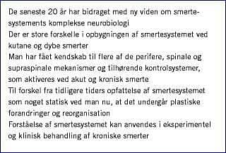 Summary The physiology of pain Ugeskr Læger 2006;168(20):1941-1943 This article reviews the basic anatomy and physiology of the normal pain system. During recent years, our knowledge of the pain system has been expanded, with increasing insight into the peripheral and central mechanisms underlying both acute and chronic pain. Several differences in the pain system exist for superficial and deep pain. Descending control mechanisms seem to be important in controlling pain, and neuroplastic changes with central reorganisation are frequently seen in patients suffering from pain. This new knowledge will help in understanding and treating patients with chronic pain syndromes.