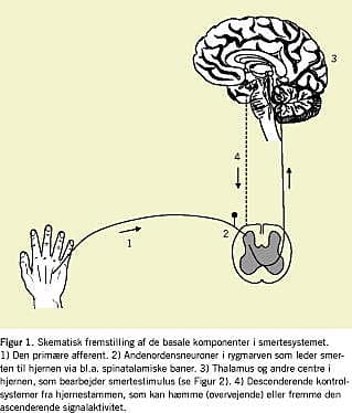 Smertesystemet består basalt set af afferente perifere nerver (første neuron), som omkobles i rygmarvens baghorn til andet neuron. Dette neuron transmitterer informationen til hjernen (tredje neuron), hvor informationen sendes videre til en række centre. Disse centre formidler smertens komplekse karakter og involverer kodning for intensitet, lokalisation, autonome, psykiske og kognitive komponenter samt det neuroendokrine respons. Parallelt hermed findes der et descenderende kontrolsystem fra hjernestammen. Dette virker ned på den afferente aktivitet i rygmarven og kan derved modulere den indkomne aktivitet (Figur 1 ).