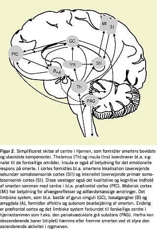 Fra rygmarven transmitteres smerterne til hjernestammen og thalamus. På Figur 2 ses de hjernestrukturer, som er vigtigst i smerteopfattelsen. Thalamus opfattes som en »mellemstation«, der koordinerer og transmitterer smertesignalerne videre til de højere strukturer, en funktion hvor også insula har betydning. De vigtigste funktioner af primær og sekundær somatosensorisk cortex er at formidle smerteintensitet og smertelokalisation. Disse områder indeholder både neuroner, der er smertespecifikke, og de før omtalte wide dynamic range -neuroner. Andre centre som insula og gyrus cinguli har betydning for de affektive og følelsesmæssige aspekter af smerten og er i forbindelse med centre i basalganglier, amygdala og hypofysen. Centre heri er involveret i det autonome og neuroendokrine respons, som kan føre til ændringer i puls og respiration samt frigivelse af stresshormoner [5]. Den motoriske cortex er involveret i afværgereflekser og adfærdsmæssige ændringer, og den præfrontale cortex er bl.a. af betydning for de kognitive funktioner ved smerte. Det vigtigste ved dette komplekse netværk er, at de forskellige centre ikke kan anskues individuelt, men at de alle er forbundne, hvorved de kan kommunikere og til dels erstatte hinanden. Man har vha. nye metoder baseret på signalanalyse været i stand til at dokumentere denne neuronale crosstalk under eksperimentel smertestimulering [6].