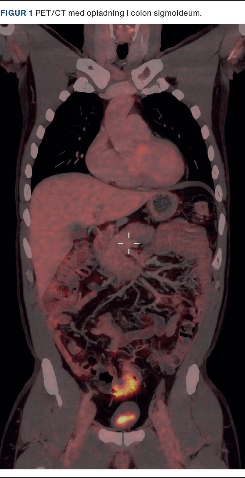 En 54-årig mand, tidligere kendt med højresidig hydrocele, opsøgte egen læge med smerter og hævelse svarende til højre testis. Patienten havde ingen gastrointestinale gener eller B-symptomer. På mistanke om epididymitis henvistes patienten til UL-undersøgelse, hvor der sås en solid tumor i højre scrotum tæt ved caput epididymis. Der blev primært mistænkt et leiomyosarkom, og patienten blev henvist til urinvejskirurgisk afdeling i pakkeforløb. Yderligere UL viste, at tumoren var afgrænset fra testis, men trykkede på denne. Mistanken blev rettet mod en adenomatoid tumor. Med usikkerhed omkring tumorens oprindelse, negative tumormarkører laktatdehydrogenase (LDH), alfaføtoprotein (AFP) og humant choiongonadotropin (HCG), og da CT ikke egnes til at klassificere uklare skrotale forandringer, blev patienten booket til operation. Der udførtes højresidig ingvinal eksploration med frysemikroskopi, hvor der blev fjernet en 1-2 cm stor tumor nær caput epididymis, og der opstod mistanke om mesoteliom, hvorfor der blev gennemført semikastratio. Histologi viste metastase af adenokarcinom, formentlig fra colon. En PET/CT (Figur 1) viste vægfortykkelse i colon sigmoideum, og patienten henvistes til koloskopi og efterfølgende robotassisteret laparoskopisk sigmoideumresektion. Histologi viste adenokarcinom med gennemvækst af peritoneum og metastaser til seks ud af 30 lymfeknuder, klassificeret som T4N2M1-adenokarcinom. Patienten påbegyndte adjuverende kemoterapi med capecitabin og oxaliplatin (CaPox). Ved seneste kontrol den 18.09.2024 var patienten rask uden tegn på recidiv.